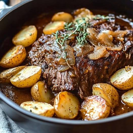 Cover and cook in oven at 300°F (150°C) for 3–4 hours, or in a slow cooker on LOW for 7–8 hours, until beef is fork-tender.