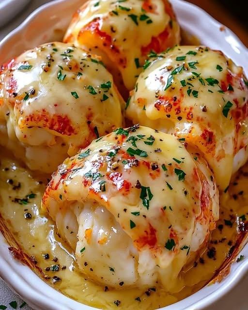 This luxurious dish features tender, juicy lobster tails baked to perfection, then drizzled with a velvety garlic cheese sauce. The combination of sweet lobster meat, rich cream, garlic, and melted cheese creates a restaurant-quality meal that’s perfect for special occasions or romantic dinners.