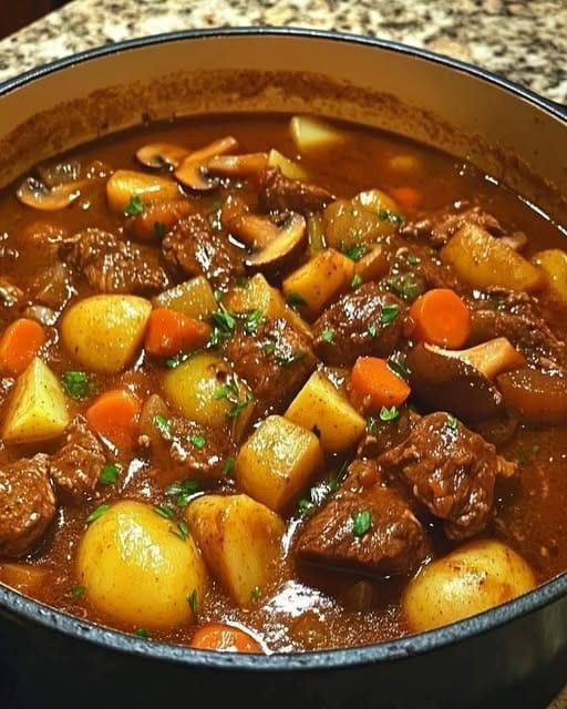 5. Simmer – Cover and let stew simmer on low for 1.5–2 hours, stirring occasionally, until beef is fork-tender.
