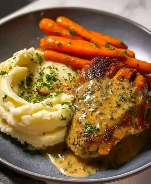 This comforting and elegant dish brings together tender pan-seared chicken smothered in a creamy herb sauce, buttery mashed potatoes, and sweet glazed carrots. It’s a wholesome, restaurant-style meal made right at home—perfect for family dinners, special occasions, or a cozy weekend treat.