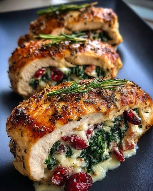 This elegant yet easy chicken dish is bursting with holiday flavors and creamy indulgence. Juicy chicken breasts are butterflied and stuffed with a luscious filling of brie cheese, tart cranberries, and tender spinach. The savory-sweet combination makes every bite rich, comforting, and restaurant-worthy. Perfect for weeknight dinners or special occasions when you want to impress with minimal effort!