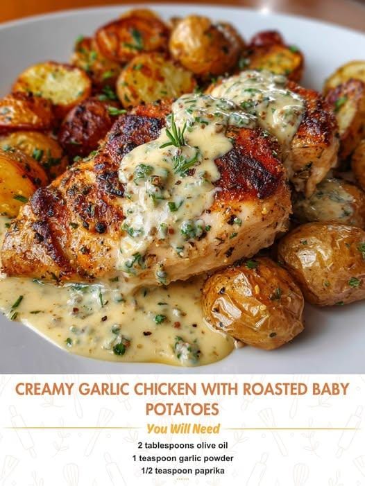 This comforting dish features tender chicken breasts simmered in a rich, creamy garlic sauce and paired with crispy, golden roasted baby potatoes. The garlic cream sauce is velvety, perfectly seasoned, and infused with fresh herbs, making it a restaurant-worthy dinner that’s simple enough for weeknights but elegant enough for entertaining.