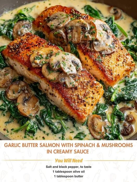 This Garlic Butter Salmon with Spinach & Mushrooms in Creamy Sauce is a restaurant-quality meal made in under 30 minutes! The salmon is pan-seared to crispy perfection, then simmered in a rich, garlicky butter sauce with earthy mushrooms and tender spinach. It’s elegant, easy, and perfect for weeknights or dinner guests.