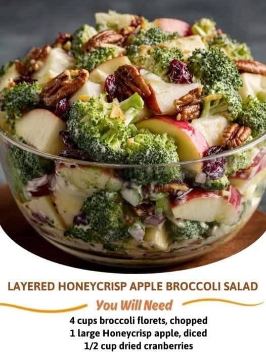 This vibrant and refreshing layered salad combines the crisp sweetness of Honeycrisp apples with nutrient-rich broccoli, crunchy sunflower seeds, chewy dried cranberries, and a creamy tangy dressing. Perfect for potlucks, BBQs, or a healthy weekday lunch, this salad balances texture, flavor, and nutrition in every bite. The layering presentation adds a colorful, eye-catching touch to any table!