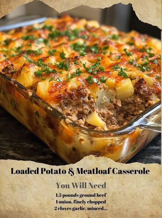 This Loaded Potato & Meatloaf Casserole combines two comfort-food favorites into one hearty dish. A juicy, seasoned meatloaf base is topped with creamy mashed potatoes, melted cheese, and crispy bacon, making it a full meal in a single bite. Perfect for family dinners, gatherings, or meal prep, this casserole is satisfying, filling, and loaded with flavor.