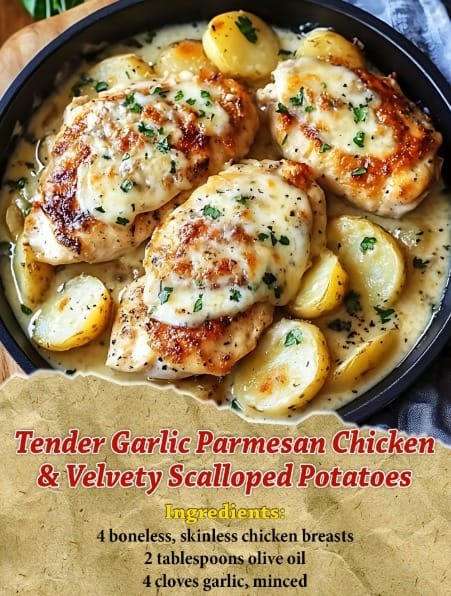 This cozy dish combines juicy, golden-baked chicken breasts coated in a rich garlic Parmesan sauce with creamy, melt-in-your-mouth scalloped potatoes layered in a velvety cream. Perfect for family dinners, holidays, or any comforting meal, it’s a show-stopping main and side in one dish. The savory garlic, nutty Parmesan, and smooth potatoes balance beautifully for the ultimate comfort food.