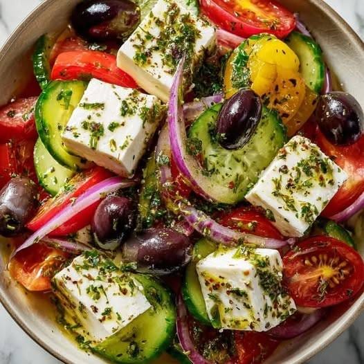 The Traditional Greek Salad (Horiatiki Salata) is a refreshing, rustic dish straight from the villages of Greece. Known for its bright flavors and simplicity, it highlights crisp vegetables, briny olives, creamy feta cheese, and a drizzle of olive oil. It’s naturally low-carb, gluten-free, and full of Mediterranean goodness, making it perfect as a side dish or a light main meal.
